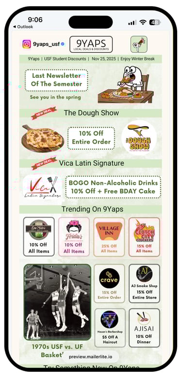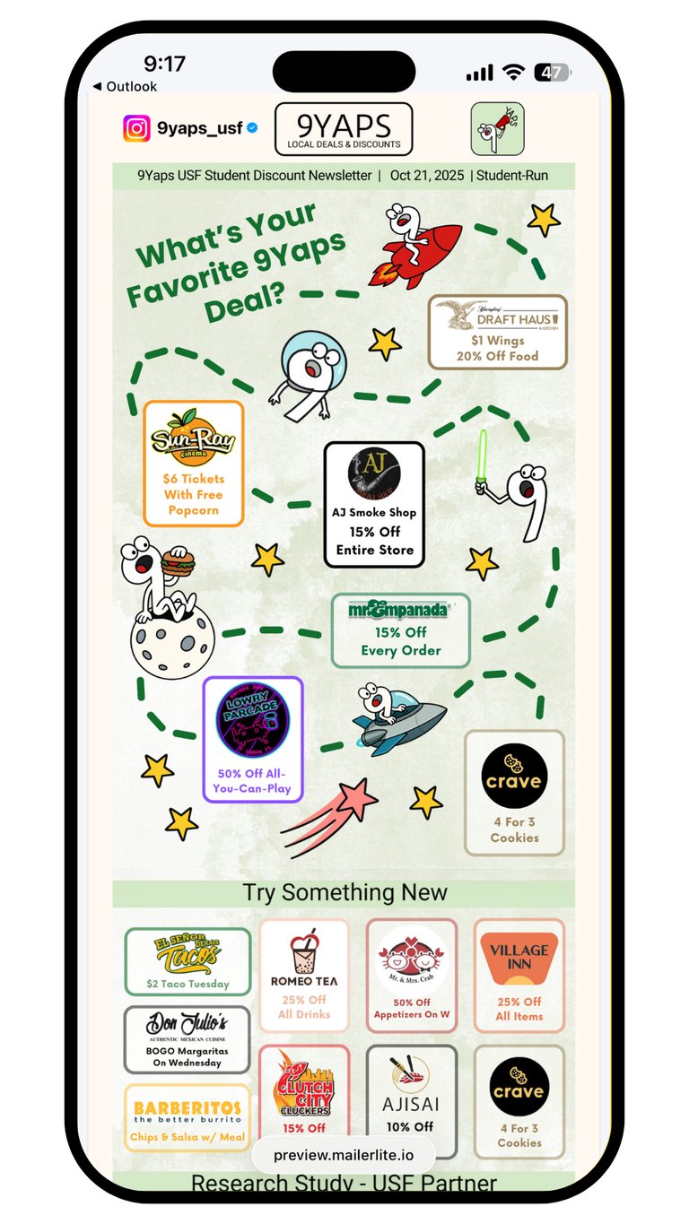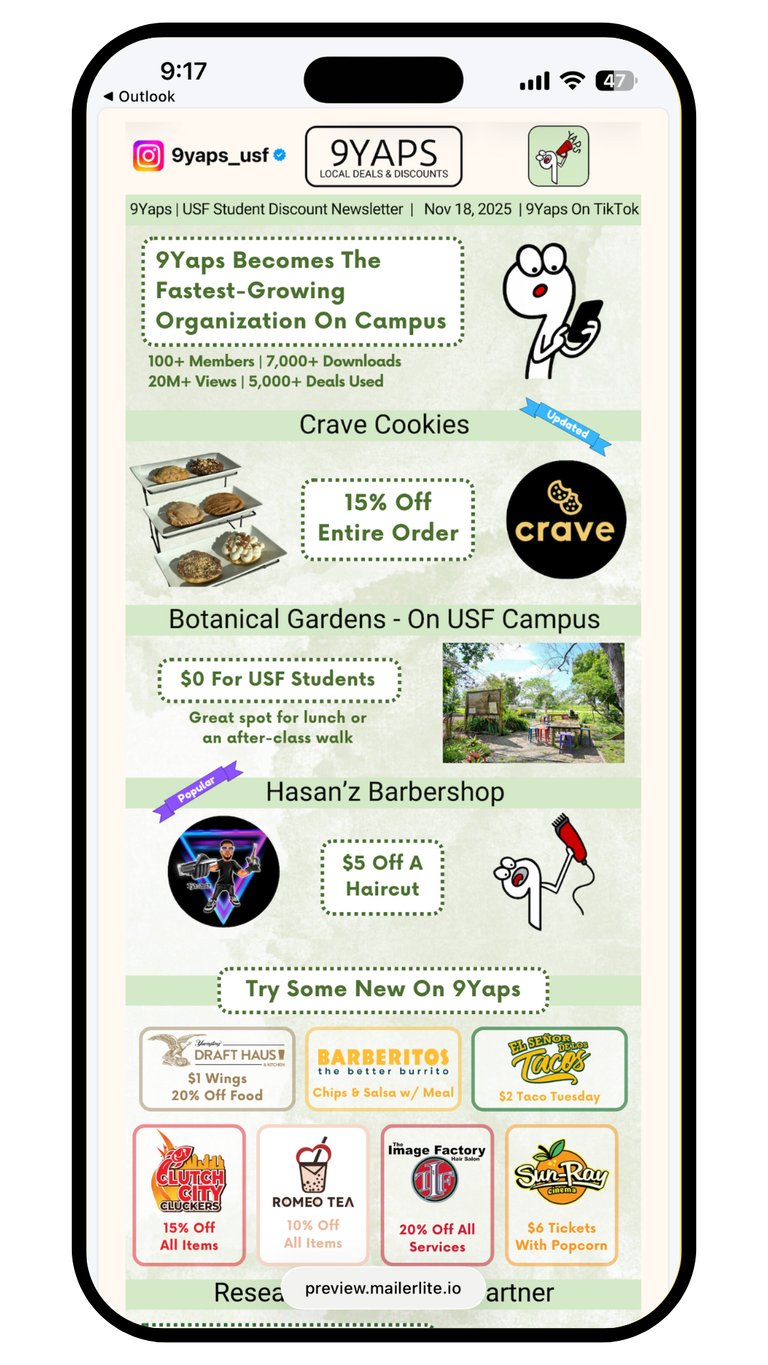 "9Yaps has been a wonderful partner and an essential part of our campaign to recruit participants for our breath diagnostics research study. While we’re a less conventional partner than most local businesses, Nicholas and the 9Yaps team were creative and flexible – working with us to leverage our study compensation as a compelling deal for their student audience. 9Yaps has been an excellent way to engage USF students, and we’ve seen strong interest translate into real, measurable foot traffic. We highly value the partnership and would recommend 9Yaps to any organization looking to reach students effectively."