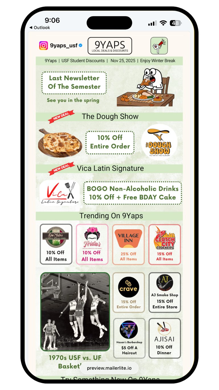 "Seen a steady visit of USF students taking advantage of our discount. Students and our staff find applying the discount app for transactions easy and efficient to use at checkout! Dealing with 9Yaps is easy, friendly, & efficient; a pleasure doing business with the team!"